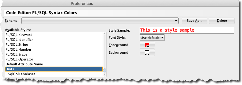 Then, after restarting SQL Developer, open the preferences dialog again and configure the style Hints the way you want.