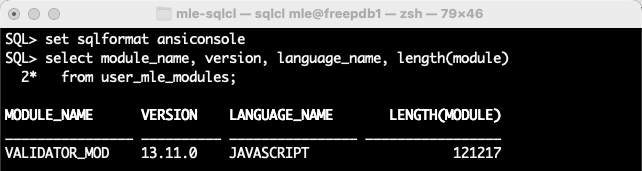 mle install validator_mod https://esm.run/validator@13.11.0 13.11.0And here is the result in SQLcl :