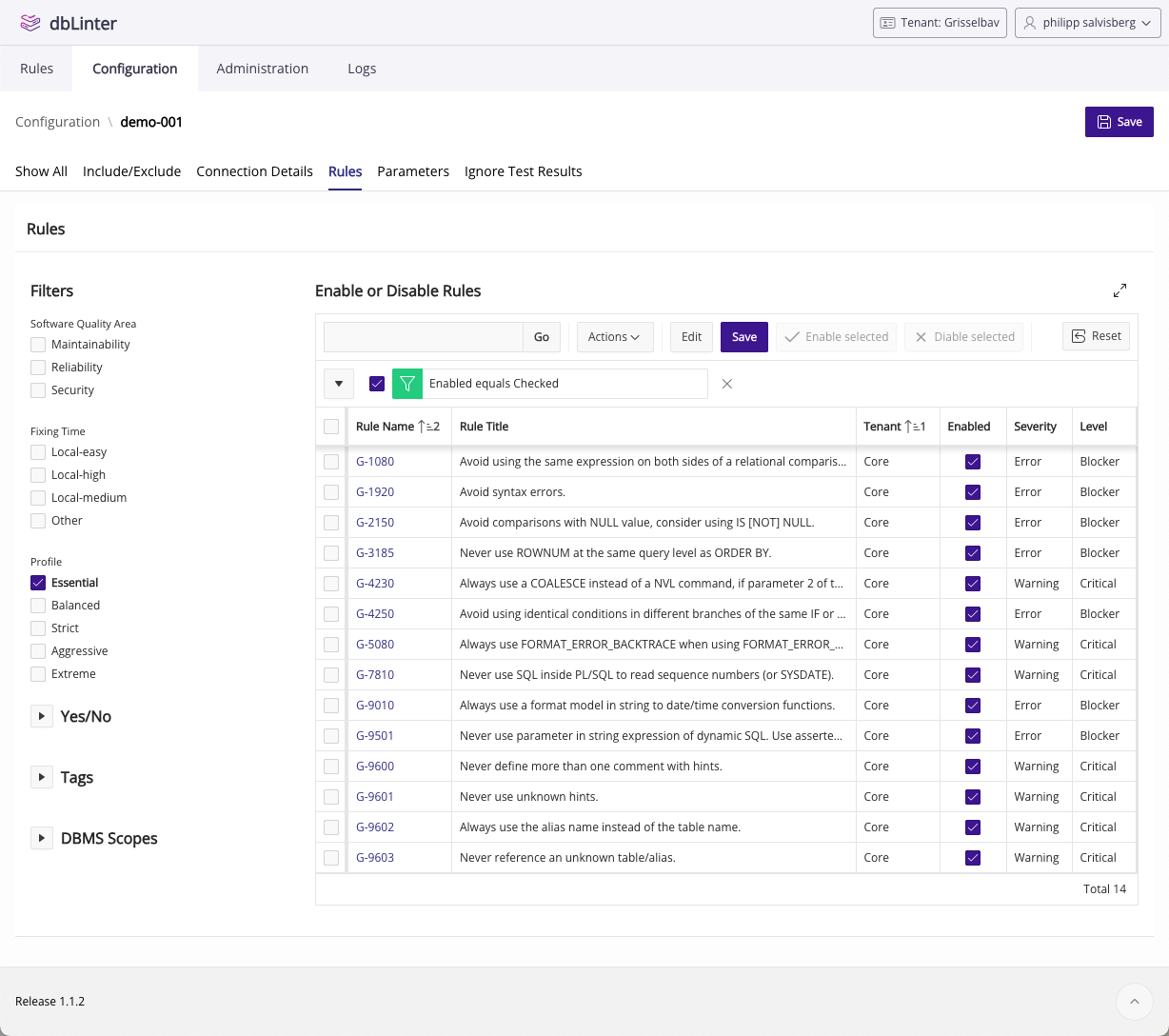 dbLinter currently offers 187 rules. This includes all the rules from the decommissioned Trivadis PL/SQL & SQL Coding Guidelines. Figure 2 shows the configuration of my 14 favourite rules. A violation of one of these rules is a bug. There is almost no room for interpretation here. The following chapters provide two examples.