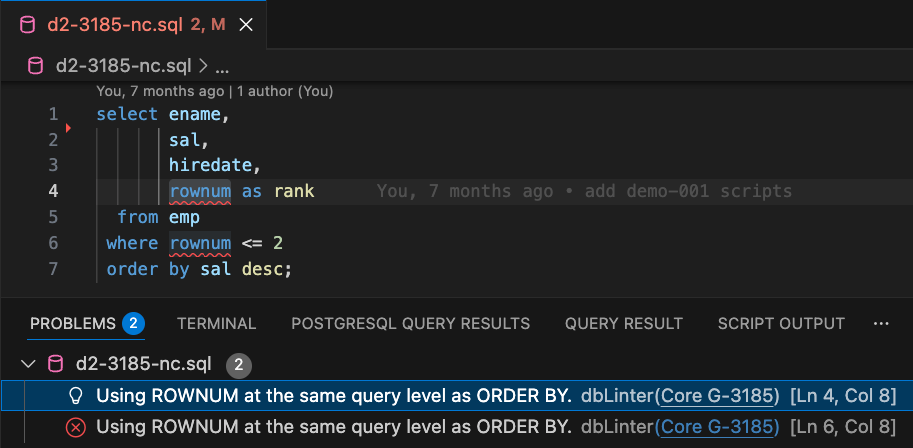 Rule G-3185 in the web GUI is explained based on a similar case in the HR schema (see Figure 4). There are two solutions here. One that can be applied in all Oracle Database versions and one that works from version 12c onwards. Listing 2 shows the traditional solution, which uses an inline view. Of course, nowadays I would always prefer a solution using the row_limiting_clause.