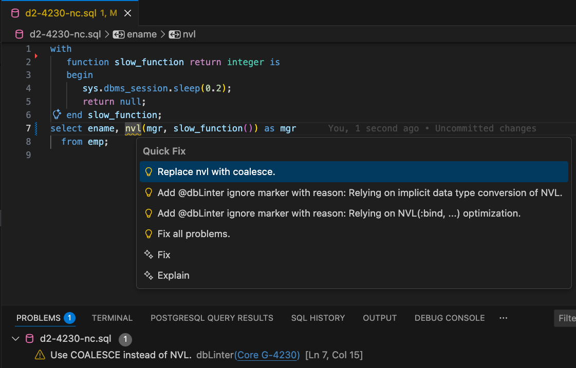 The solution proposals in Figure 5, indicated by the yellow lamp symbol, are quick fixes from dbLinter. However, the last two menu options come from GitHub Copilot.